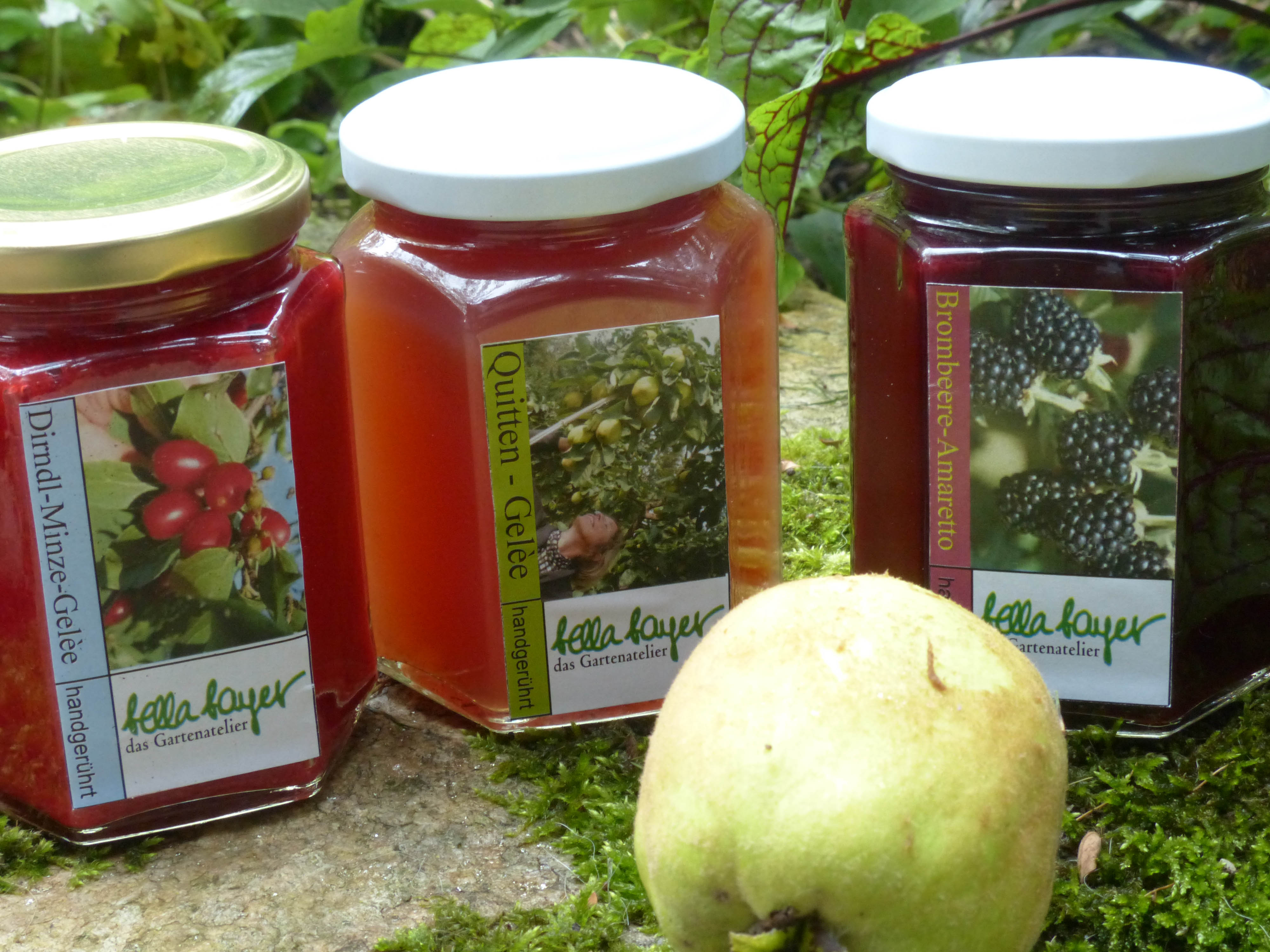 Dirndln, Quitten und Mispeln. Diese paradiesischen Früchte aus unserem Garten verarbeite ich zu köstlichen Gelèes. Schmeckt auch zu Käse hervorragend. 3 x 278ml Gläser im Geschenkkarton 15.- exkl. Porto  Bestellen per Email